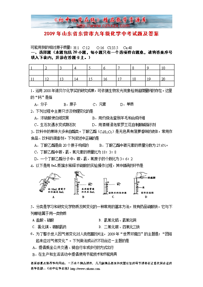 2009年山东省东营市九年级化学中考试题及答案