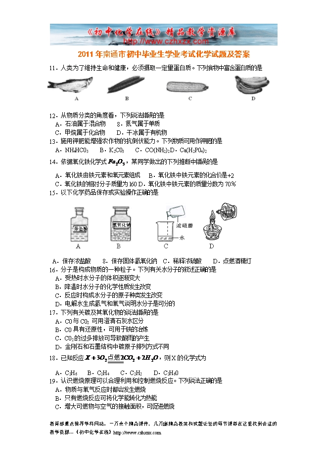 2011年南通市初中毕业生学业考试化学试题及答案