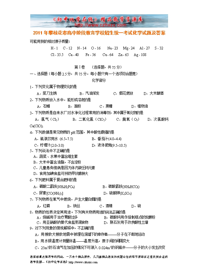 2011年攀枝花市高中阶段教育学校招生统一考试化学试题及答案