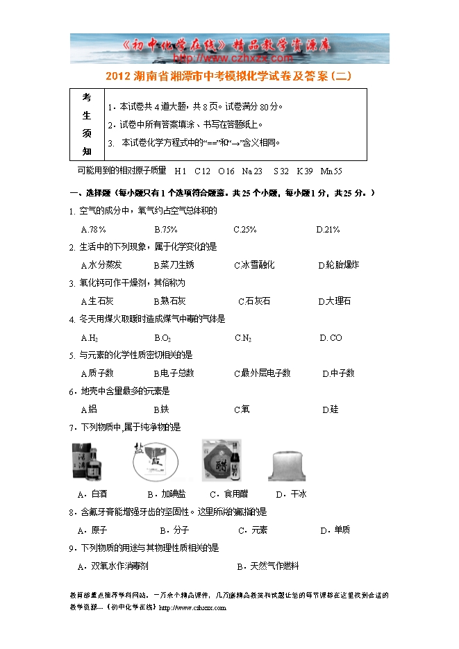 【内容简介】一、单项选择题(本大题共8小题,每小题2分,共16分)1.(2分)物质世界充满着神奇的变化。下列过程中主要发生了化学变化的是( )A.粮食酿酒 B.海水晒盐 C.苹果榨汁 D.棉花纺纱2.(2分)化学用语是学习化学的重要工具。下列化学用语书写正确的是( )A.2个氦原子:2Ne B.乙醇的化学式:C2H5OH C.氨气中氮元素的化合价: D.保持氧气化学性质的最小微粒:O3.(2分)化学就在我们身边。下列知识归纳有错误的是( )选项 知识归纳A.化学与家居 ①由含有化学合成纤维的衣料制成的衣服,牢固耐穿②新装修的房屋中放置活性炭包除异味,利用了活性炭的吸附性B.化学与出行 ①“共享电动车”方便市民绿色出行,减少了大气污染②高铁车头用到的玻璃钢是应用最广泛的复合材料......