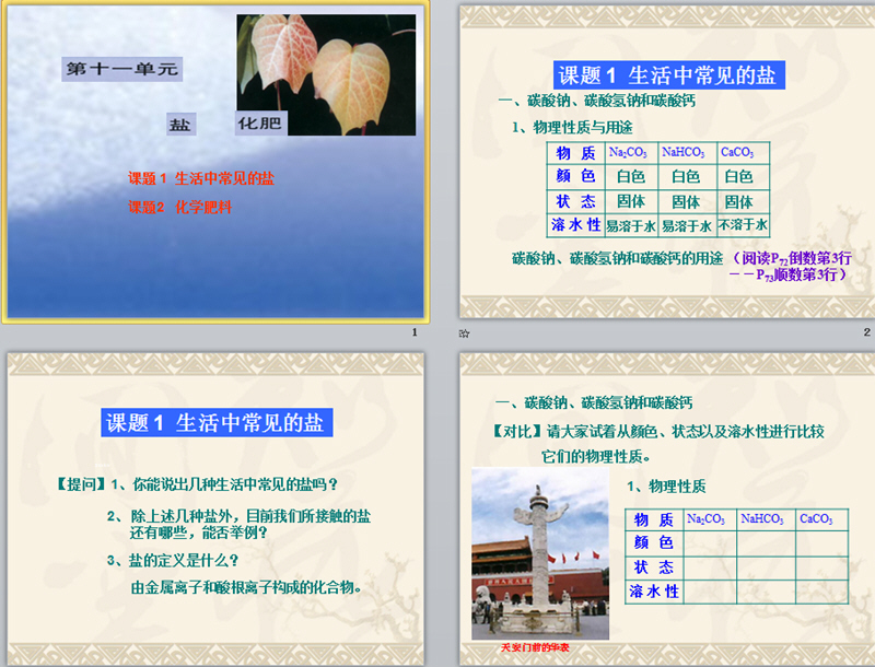 本课件以2012新人教版教材第十一单元酸和碱第一节生活中常见的盐为基础制作,共有10张幻灯片组成,重点突出,资料齐全。