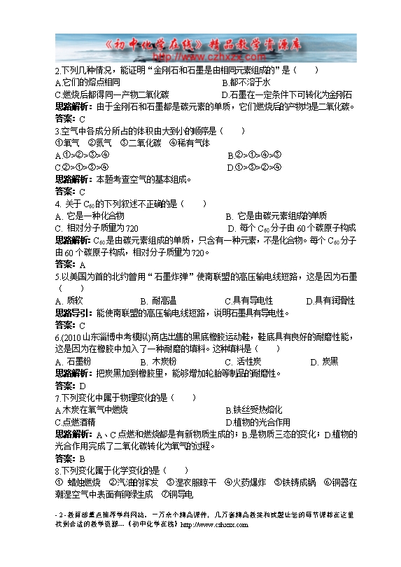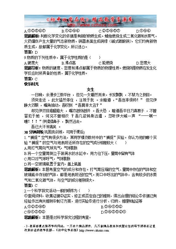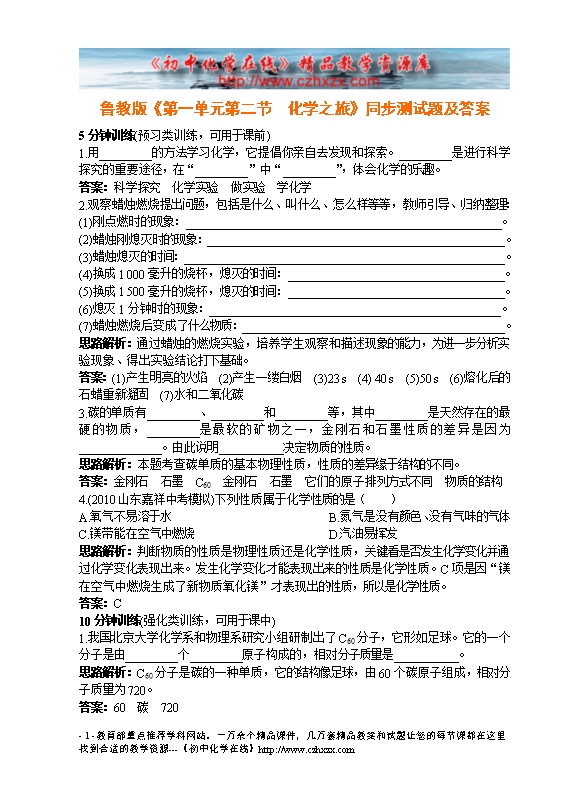 鲁教版《第一单元第二节 体验化学探究》同步测试题及答案
