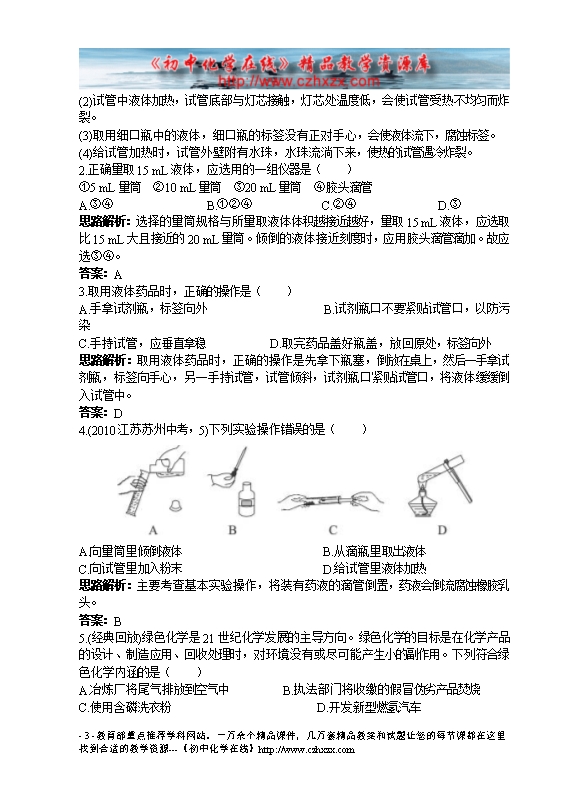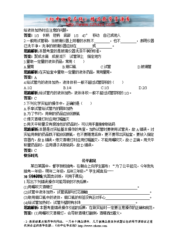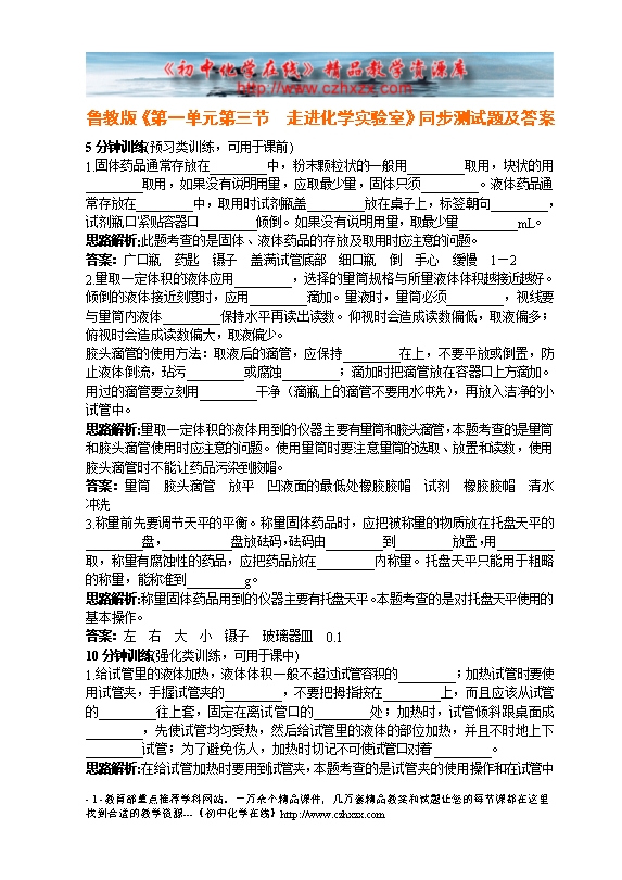 鲁教版《到实验室去:化学基本技能训练(一)》同步测试题及答案