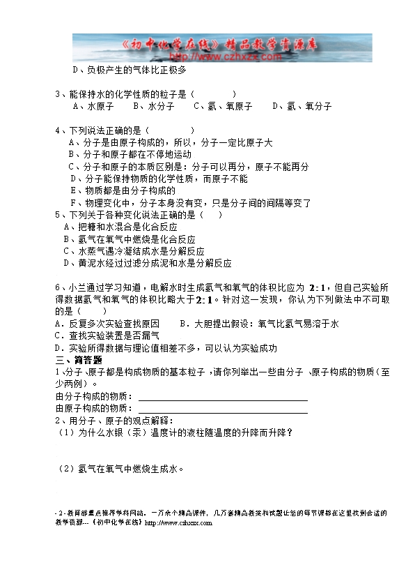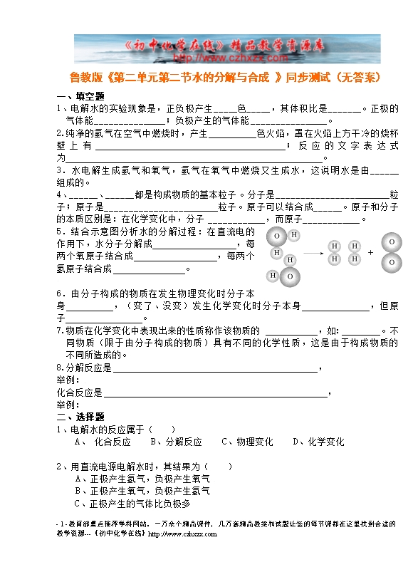 - 下一份试卷:鲁教版《第二单元第三节 原子的构成》同步测试(无答案)