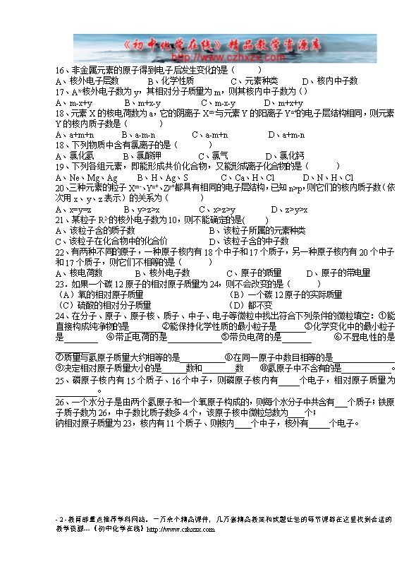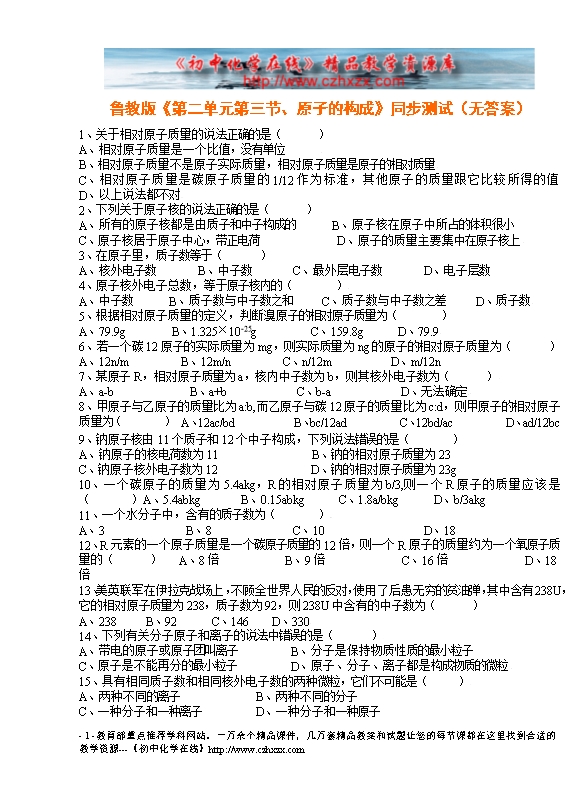 鲁教版《第二单元第三节 原子的构成》同步测试(无答案)