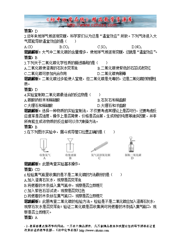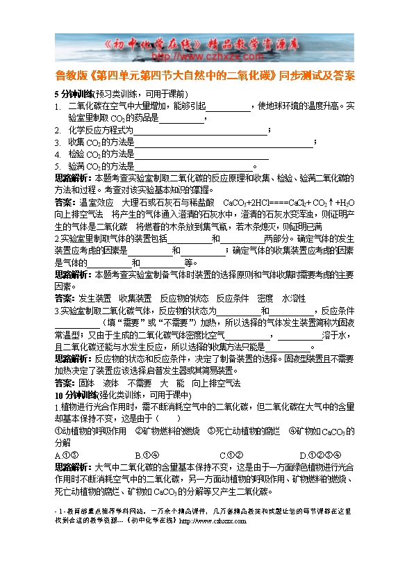 鲁教版《第四单元第三节 大自然中的二氧化碳》同步测试及答案