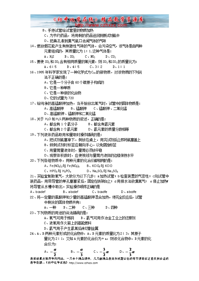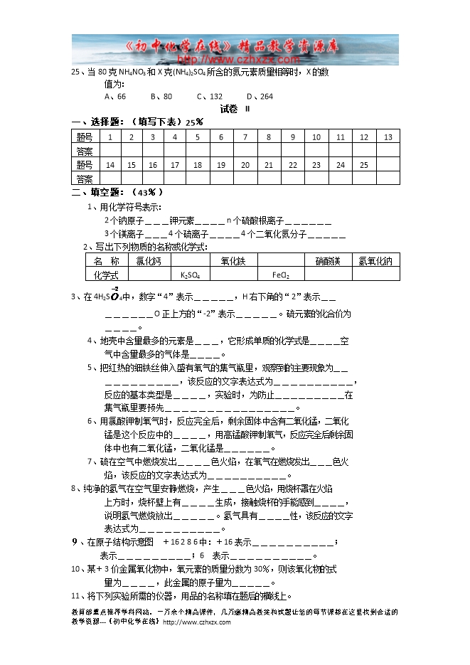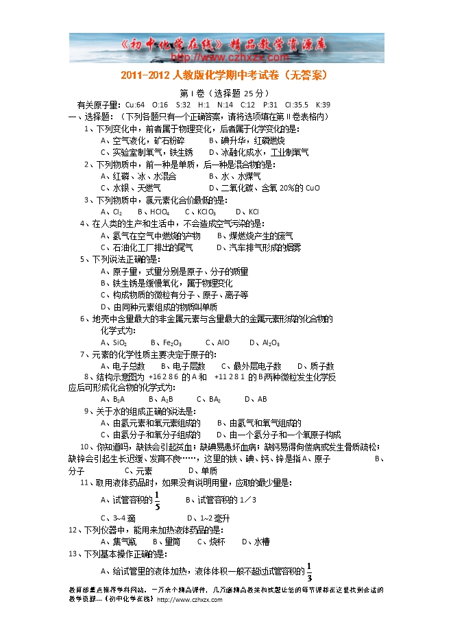 2011-2012人教版化学第一学期期中测试试卷1(无答案)