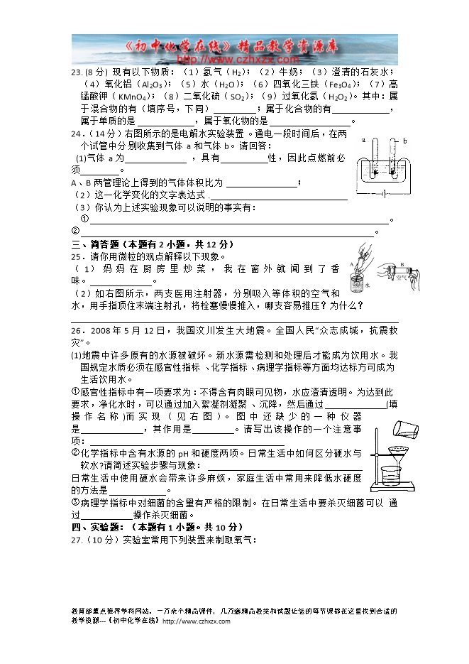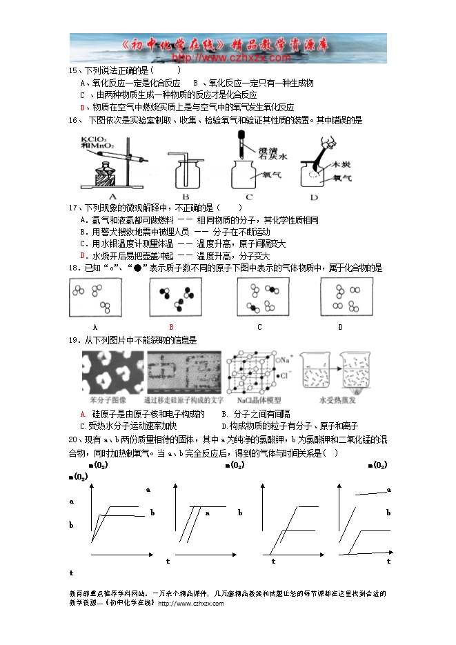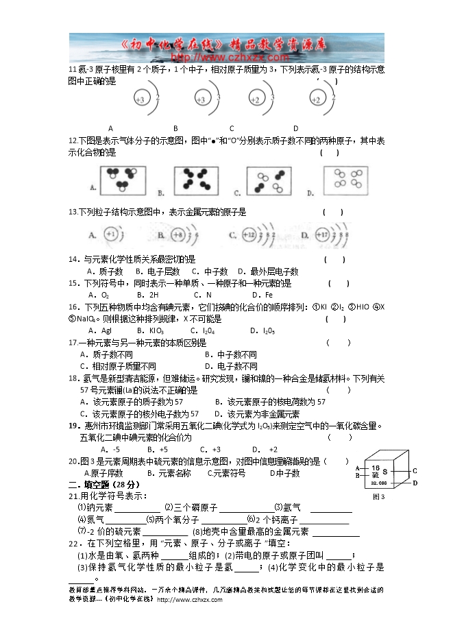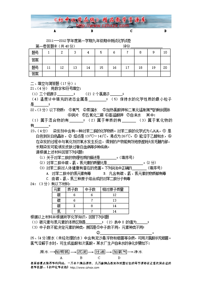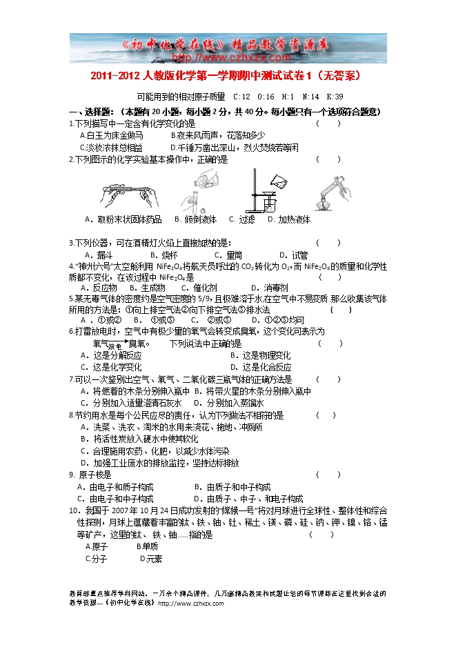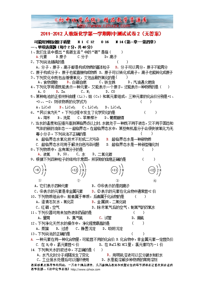 2011-2012人教版化学第一学期期中测试试卷2(无答案)