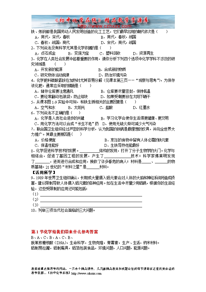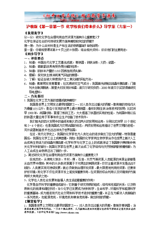 沪教版《第一章第一节 化学给我们带来什么》导学案(方案一)