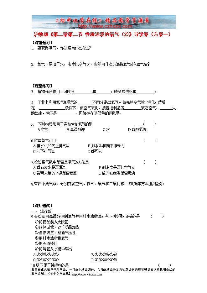 沪教版《第二章第一节 性质活泼的氧气(2)》导学案(方案一)
