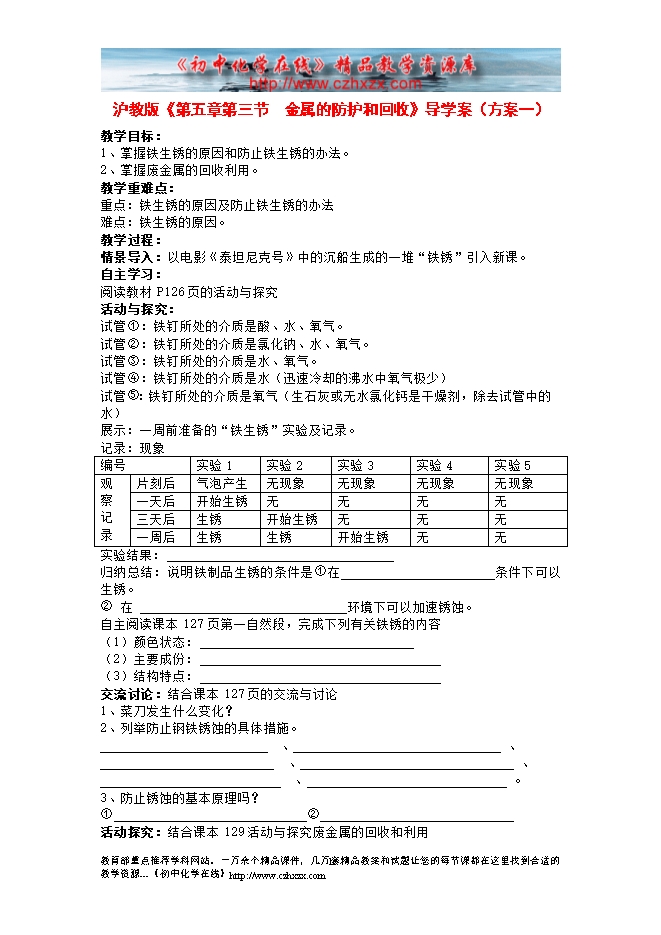 沪教版《第五章第三节 金属防护和废金属回收》导学案(方案一)