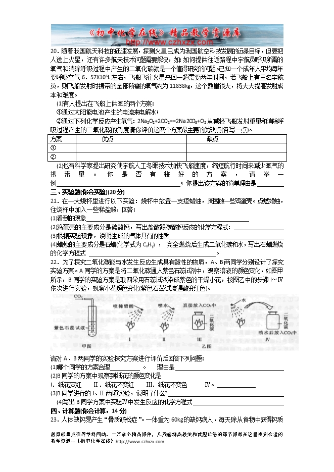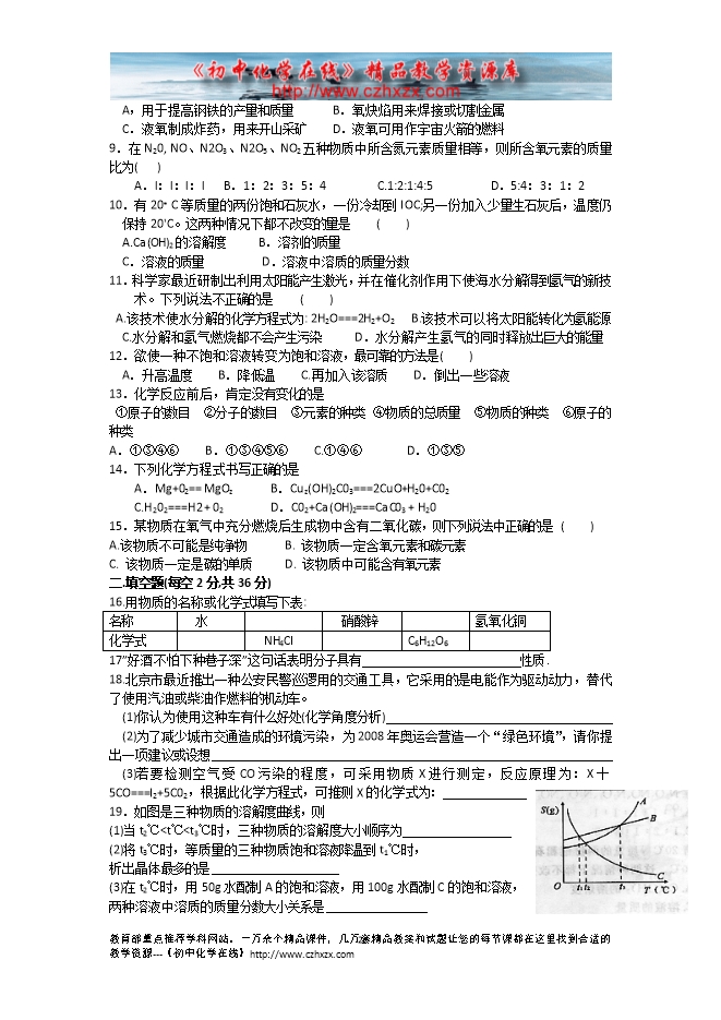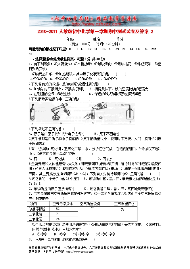 2010-2011人教版初中化学第一学期期末测试试卷及答案 2