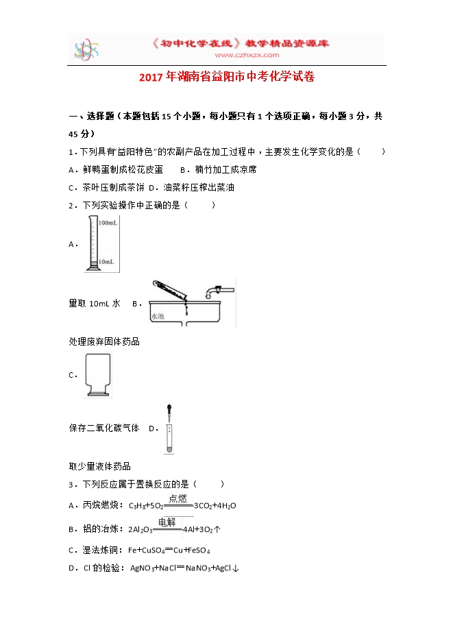 2017年湖南省益阳市中考化学试题(word版,含答案解析)