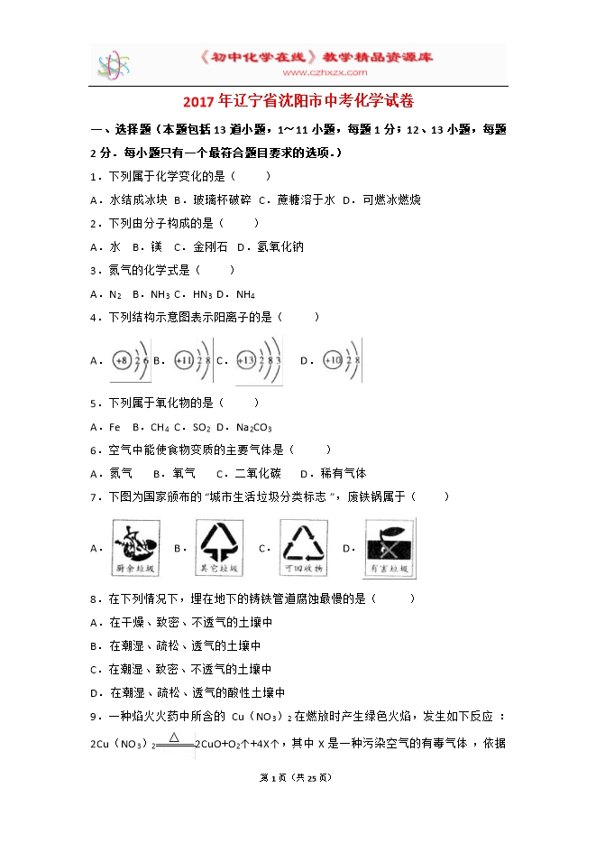2017年辽宁省沈阳市中考化学试题(word解析版)