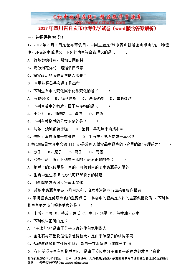 2017年四川省自贡市中考化学试卷(word版含答案解析)