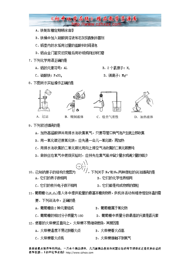 江苏省苏州高新区2010-2011初中化学第一学期期末测试试卷及答案
