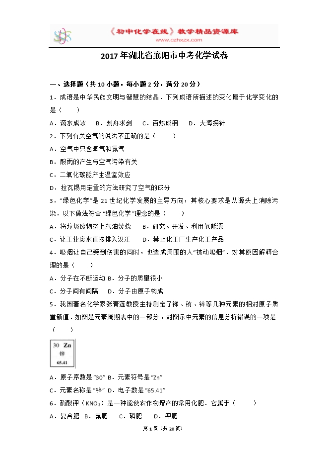 2017年湖北省襄阳市中考化学试卷(word解析版)