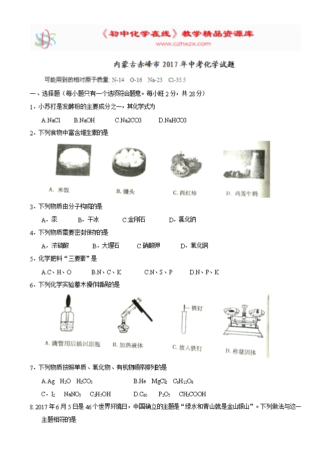 2017年内蒙古赤峰市中考化学试题(精校word版,含答案)
