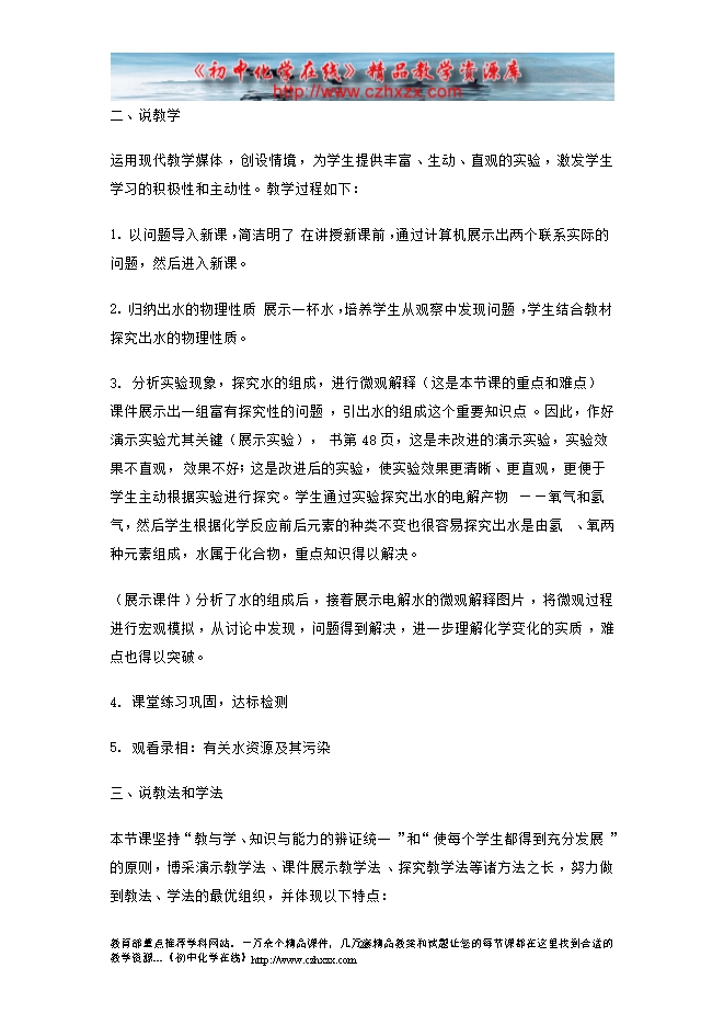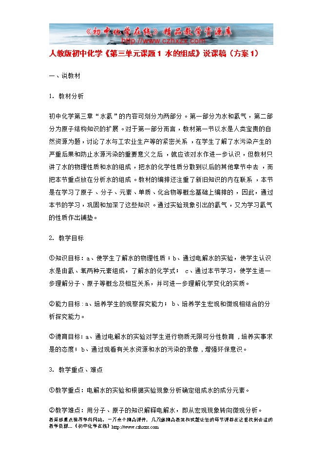 人教版初中化学《第四单元课题3 水的组成》说课稿(方案1)