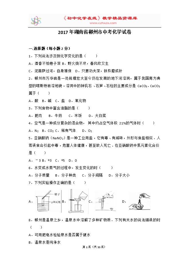2017年湖南省郴州市中考化学试卷(word解析版)