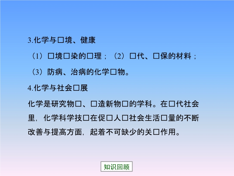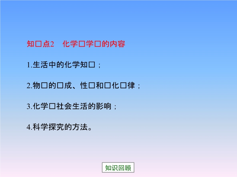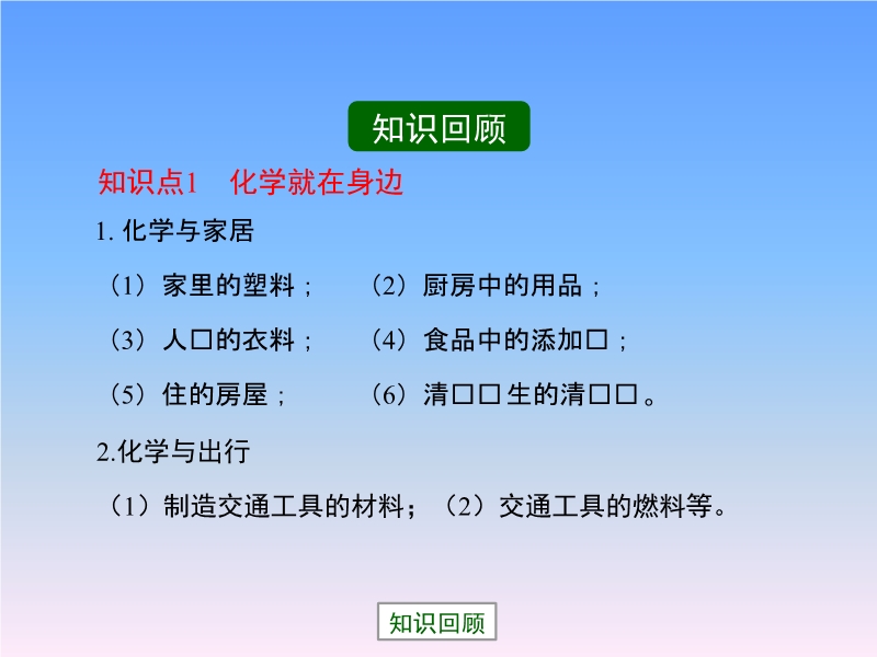 【内容简介】内蒙古宁城县向阳中学科粤版九年级上册:《第一章第1节 身边的化学》复习课件