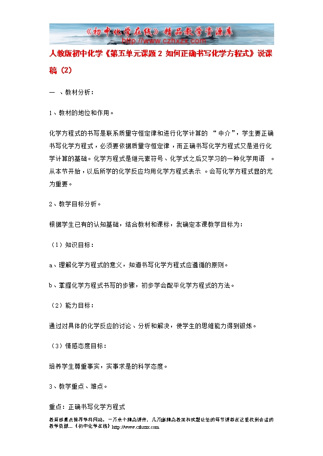 人教版初中化学《第五单元课题2 如何正确书写化学方程式》说课稿(2)