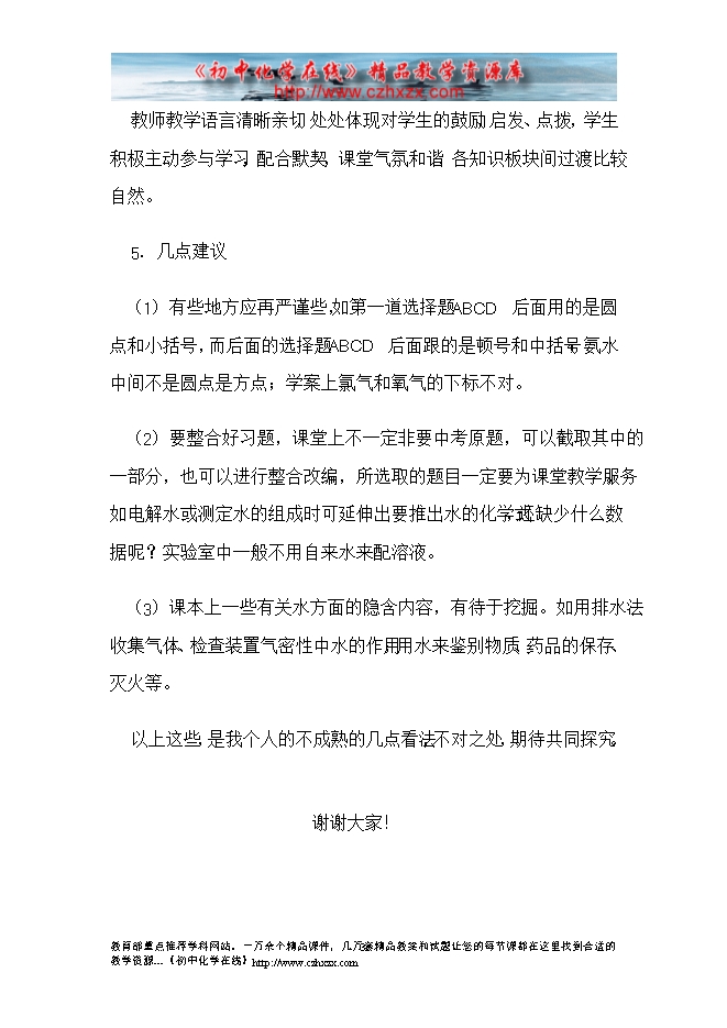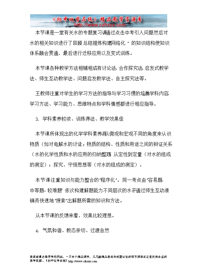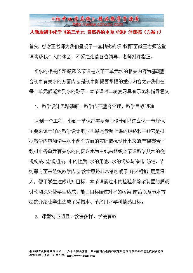 人教版初中化学《第四单元 自然界的水复习课》评课稿(方案1)
