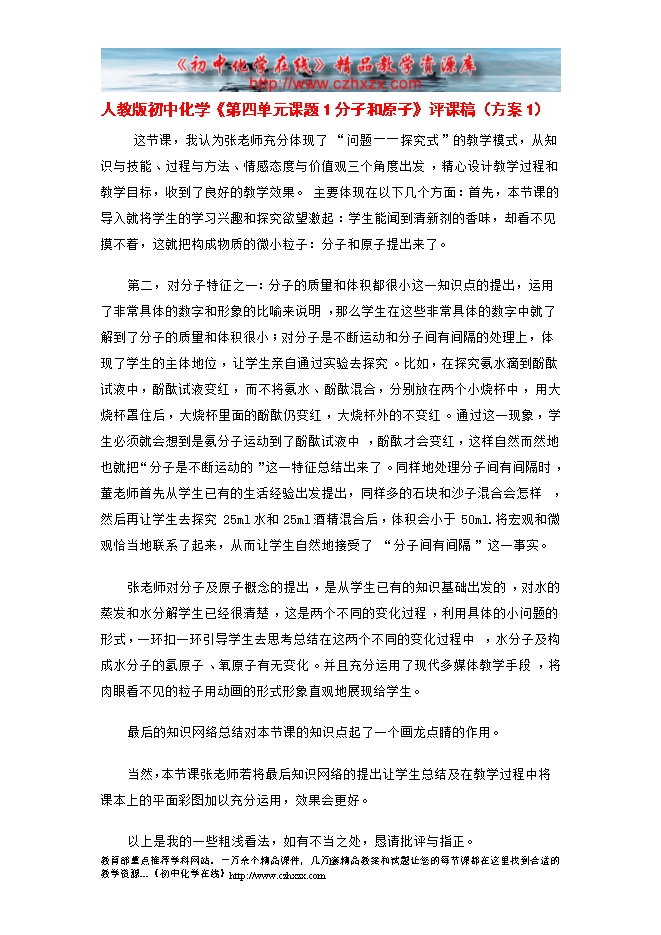 人教版初中化学《第三单元课题1 分子和原子》评课稿(方案1)