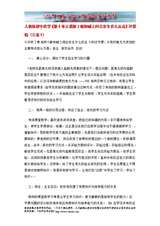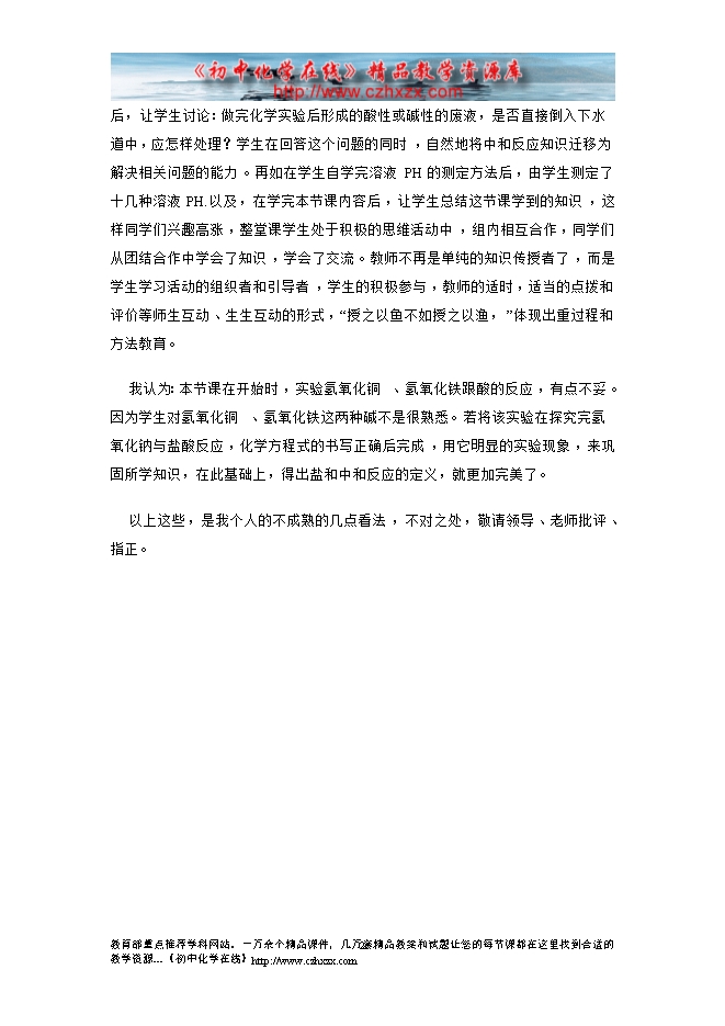 人教版初中化学《第十单元课题2 酸和碱的中和反应》评课稿(方案1)