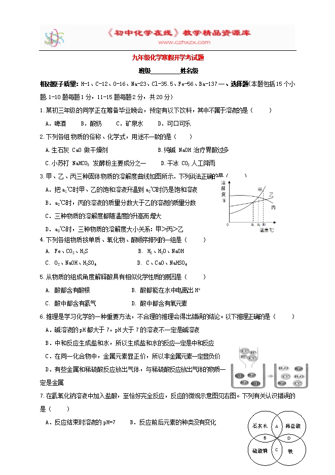 山东省沂源县三岔中心学校2017届九年级下学期开学检测化学试题(无答案)(鲁教版)