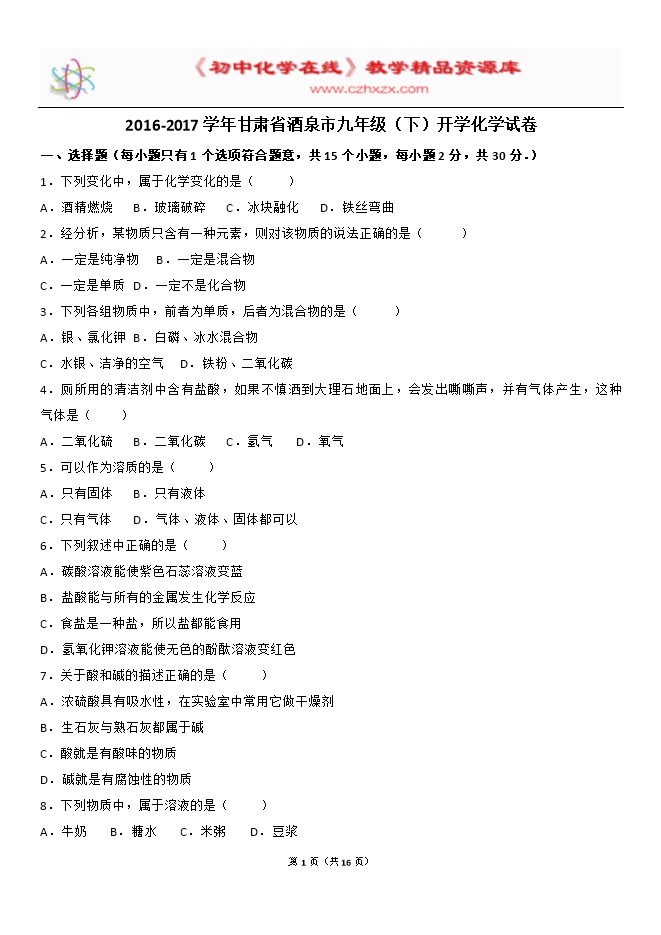甘肃省酒泉市2017届九年级(下)开学化学试卷(word解析版)(人教版)