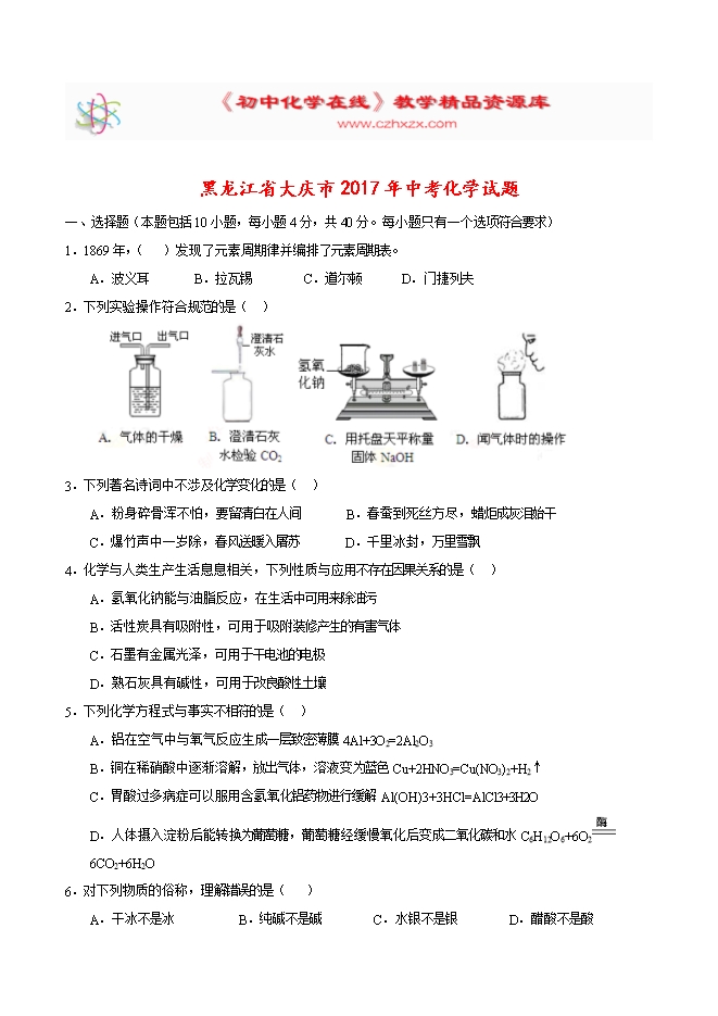 2017年黑龙江省大庆市中考化学试题(精校word版,含答案)