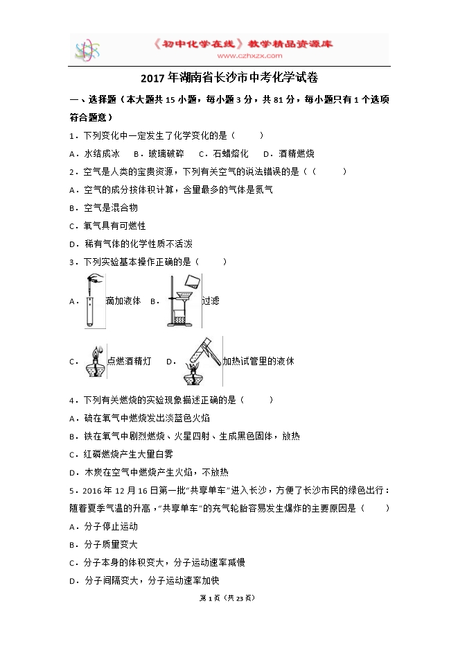 2017年湖南省长沙市中考化学试卷(word解析版)