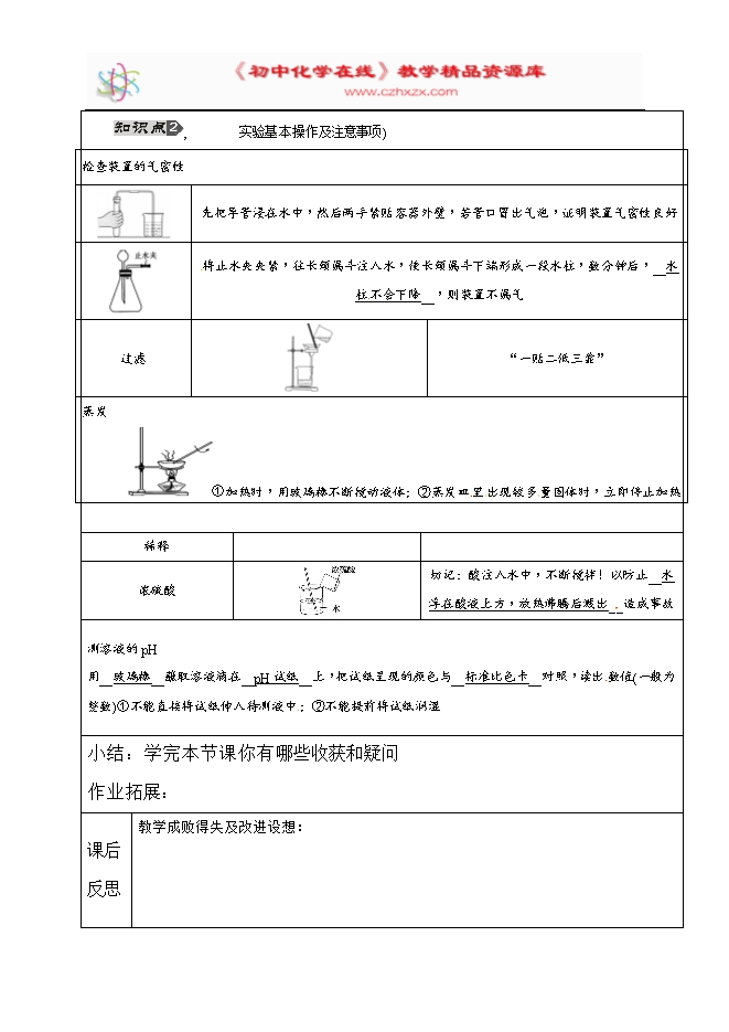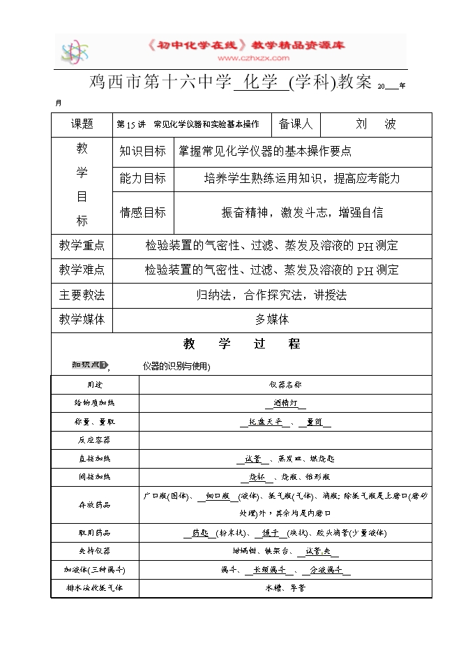 黑龙江省鸡西市第十六中学中考复习《第15讲 常见化学仪器和实验基本操作》复习教案