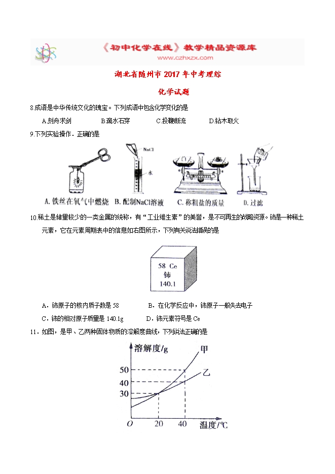 2017年湖北省随州市中考理综(化学部分)试题(精校word,含答案)