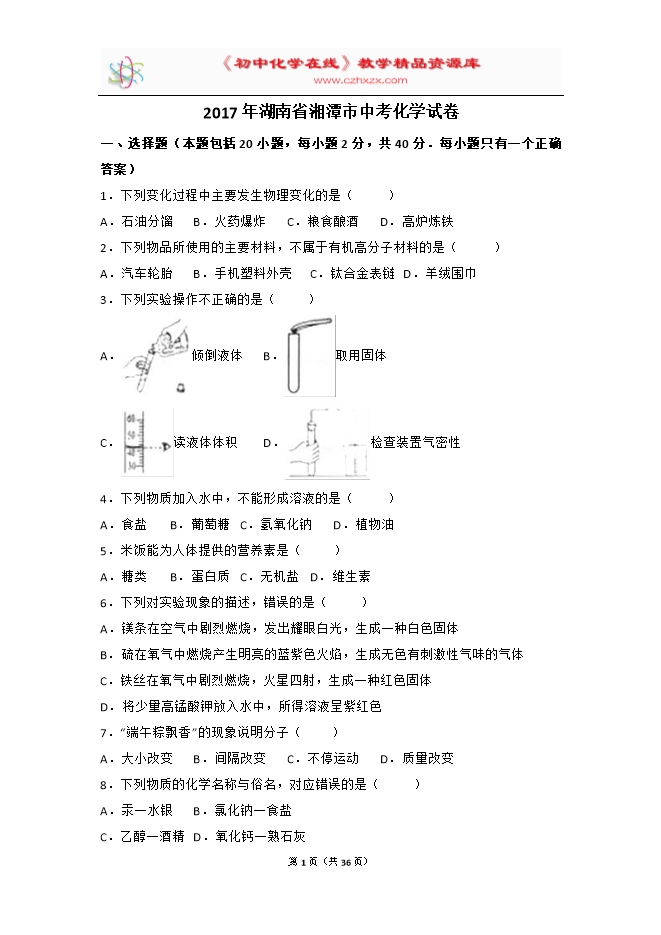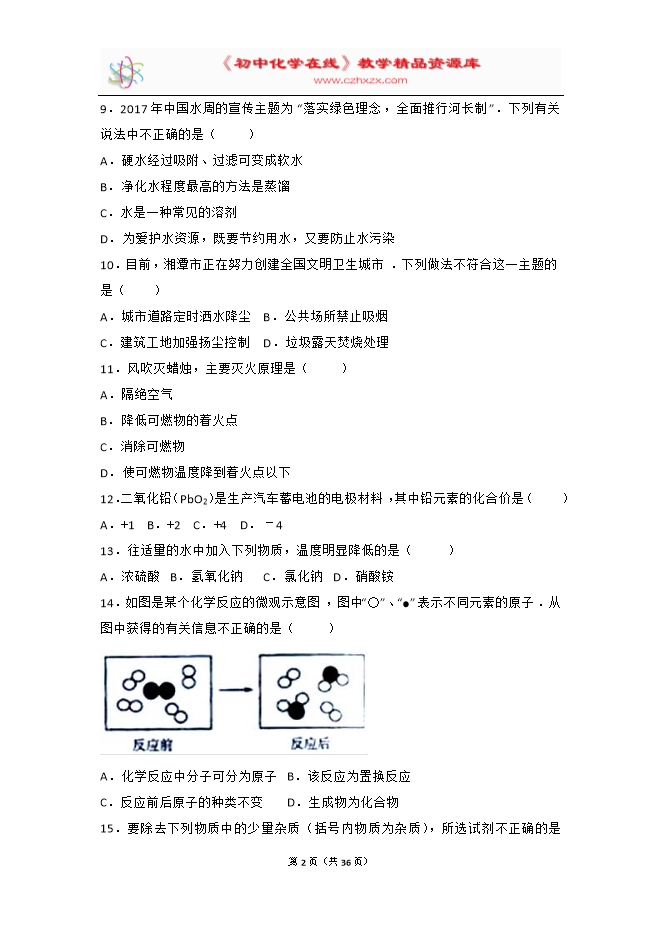 2017年湖南省湘潭市中考化学试卷(word解析版)