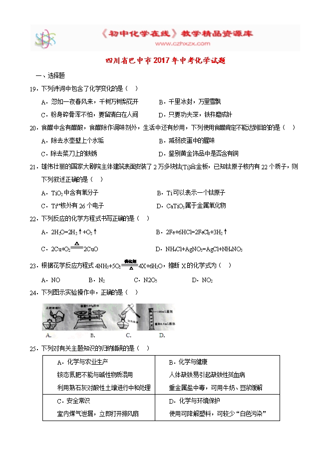 2017年四川省巴中市中考化学试题(精校word版,含答案)