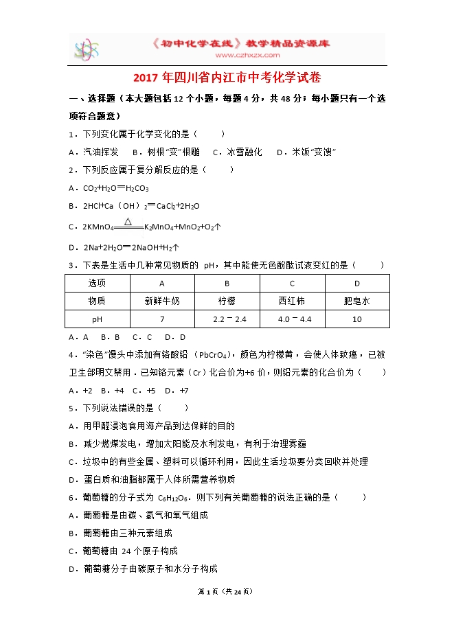 - 上一份试卷:2017年四川省广安市中考化学试卷(word解析版)