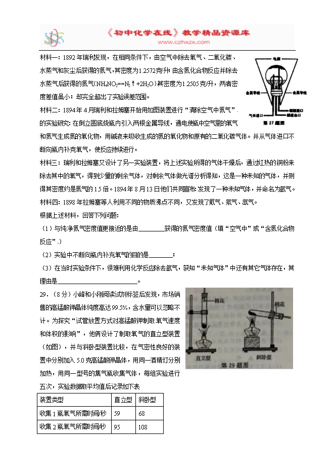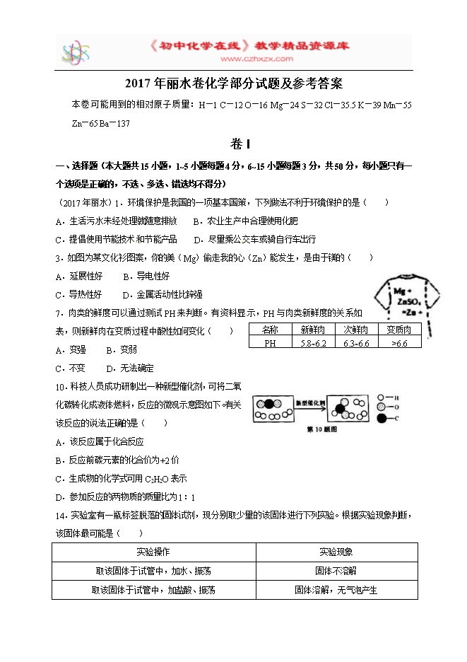 2017年浙江省丽水市中考化学试题(word版,含答案)