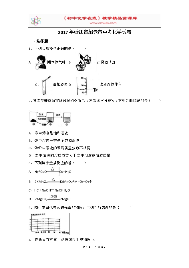 2017年浙江省绍兴市中考化学试卷(解析版)