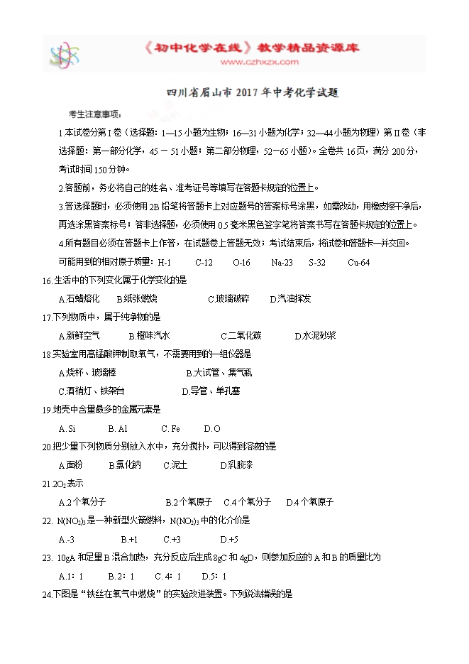 2017年四川省眉山市中考化学试题(精校word版,含答案)