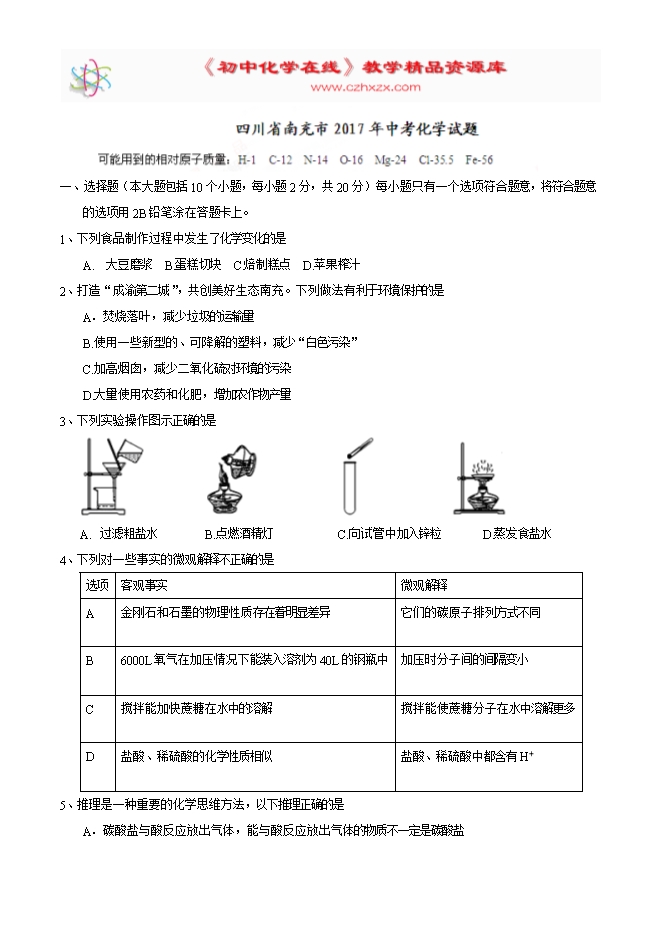 2017年四川省南充市中考化学试题(精校word,含答案)