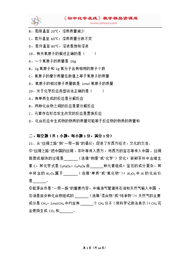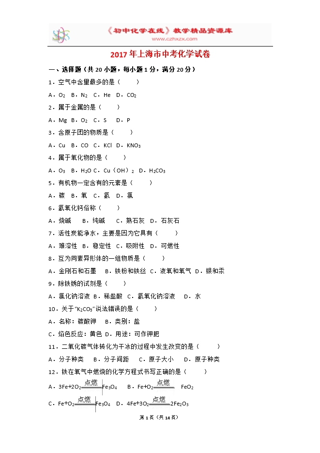 2017年上海市中考化学试卷(word解析版)
