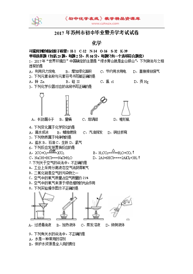 2017年江苏省苏州市初中毕业暨升学考试试卷 (Word版含答案)