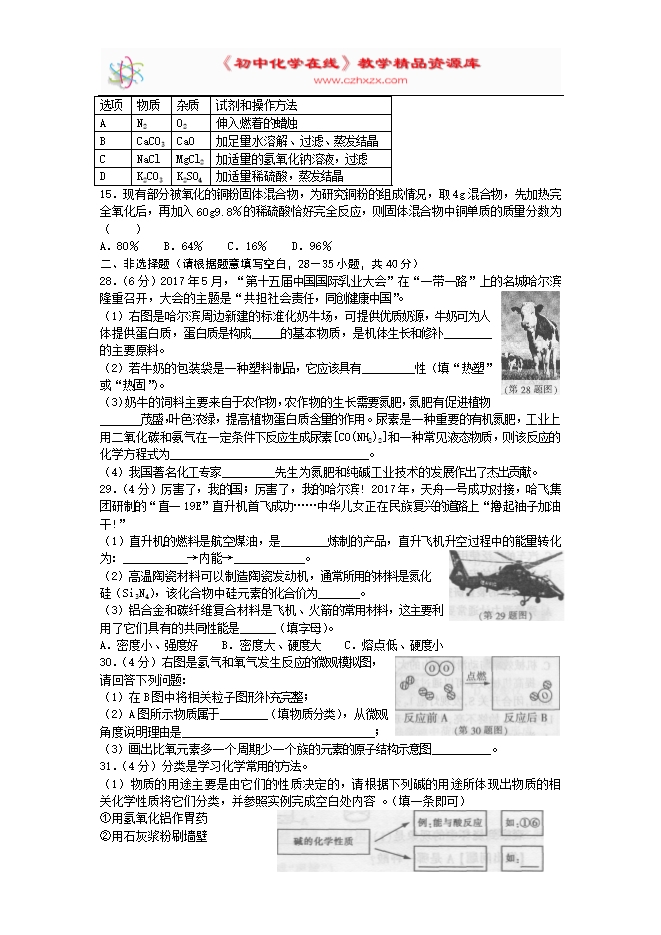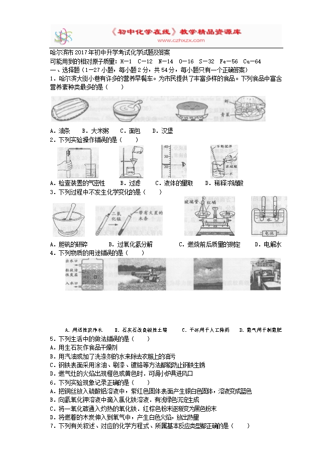 2017年黑龙江省哈尔滨市中考理综(化学部分)试题(word版,含答案)