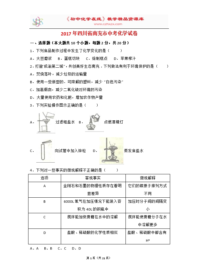 2017年四川省南充市中考化学试卷(word解析版)