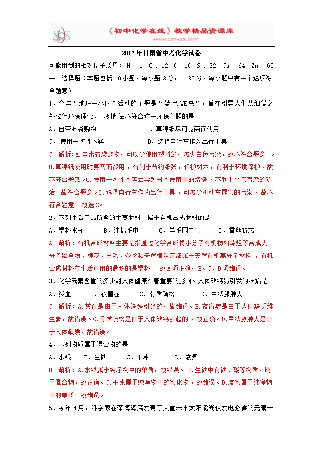 所属专辑: 《2017年各省市中考化学真题》专辑