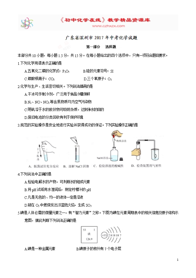 2017年广东省深圳市中考化学试题(精校word版,含答案)