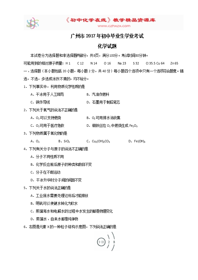 2017年广东省广州市初中毕业生学业考试化学试题(WORD版,含解析)