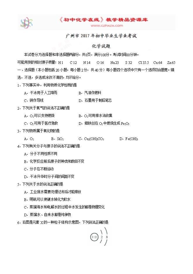 2017年广东省广州市初中毕业生学业考试化学试题(精校word,含word答案)